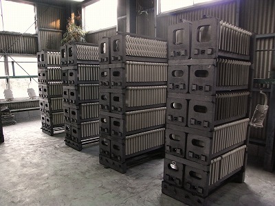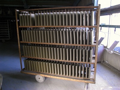 プレスしたら、乾燥台車に丁寧に載せていきます。