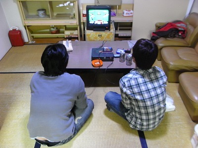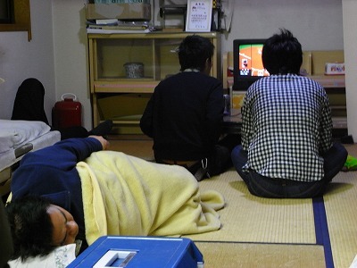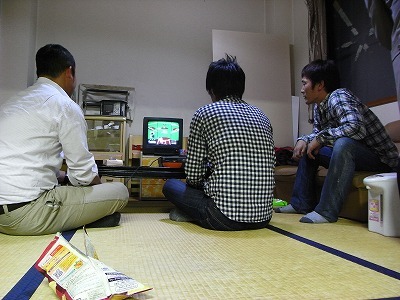 おっさんたちが、テレビの画面で繰りひろげられる戦いに夢中です。