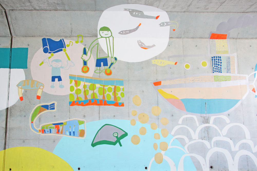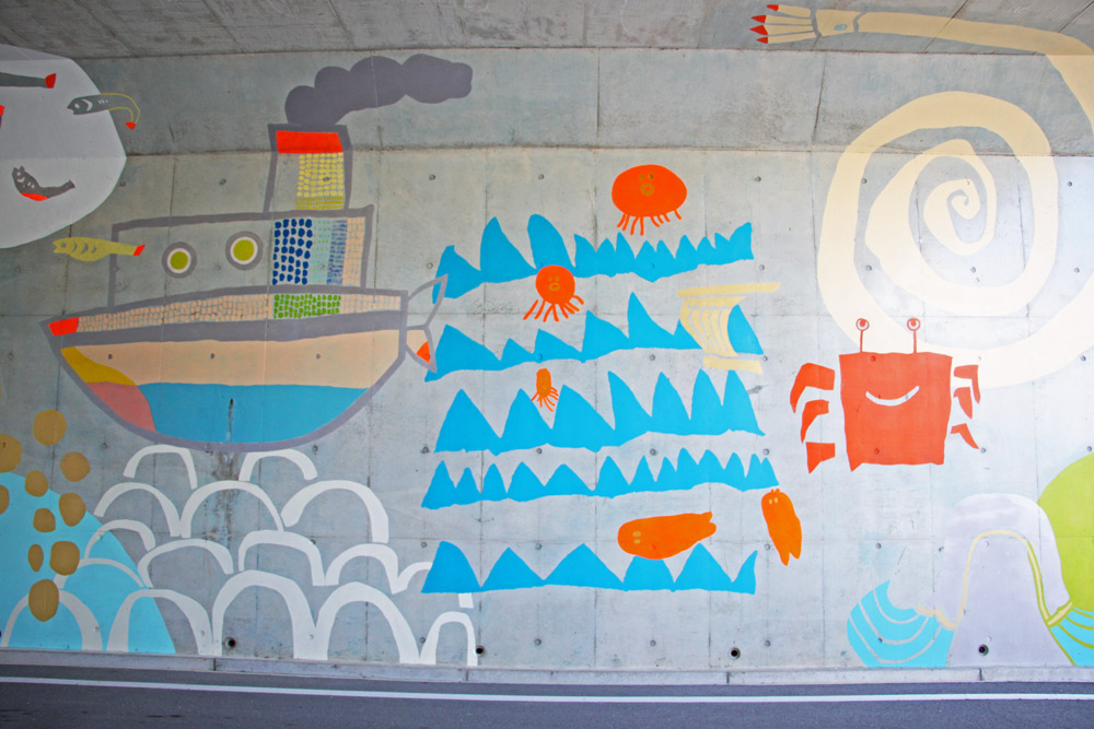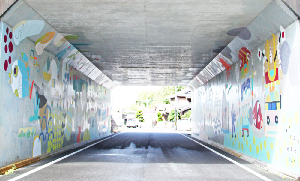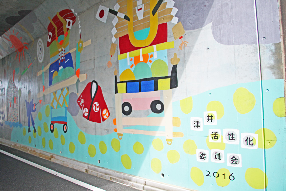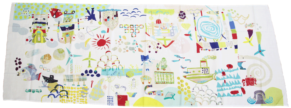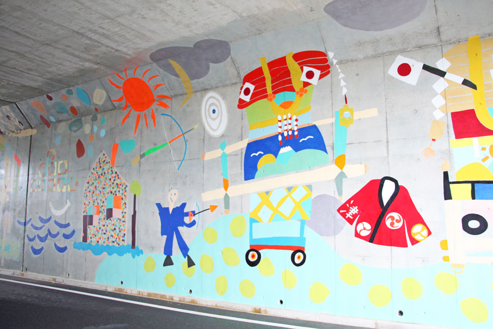 淡路島の片隅にある小さな町「津井」。 400年も続く瓦の産地で、日本三大産地の一つです。 この小さな町津井ですが、人口減少、高齢化などで衰退が進んでいます。 「このままじゃまずい!」と、地域を思う若手から年配の方々が 津井をもう一度元気よくするために立ち上がりました。 そこで第一弾が、津井独特のモノを絵にしてトンネルに描きました。 そのトンネルの完成記念手ぬぐいです。